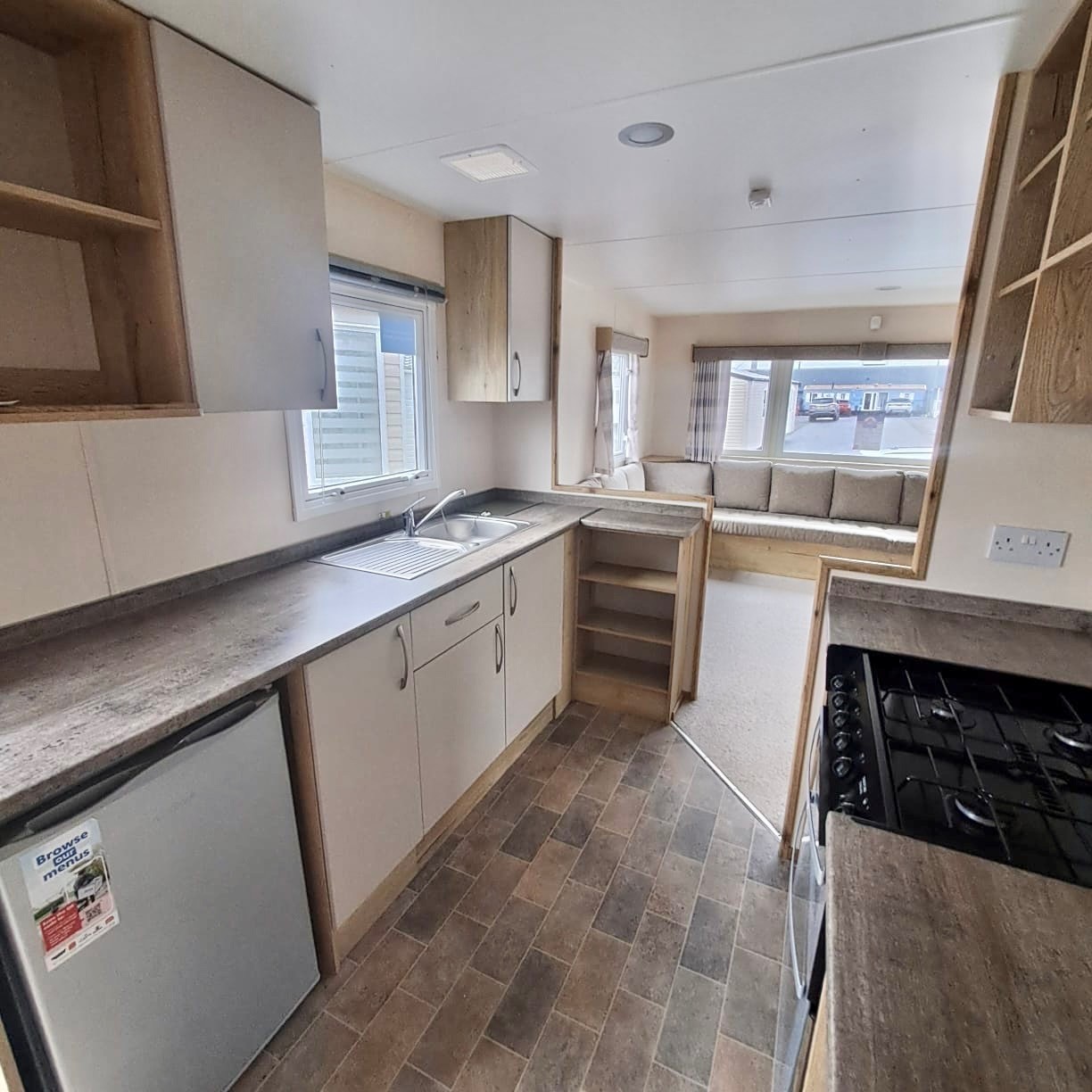 Galley style kitchen across two sides, lino flooring, shelving, wine rack, worktop spaces, Oven Grill & Hob
