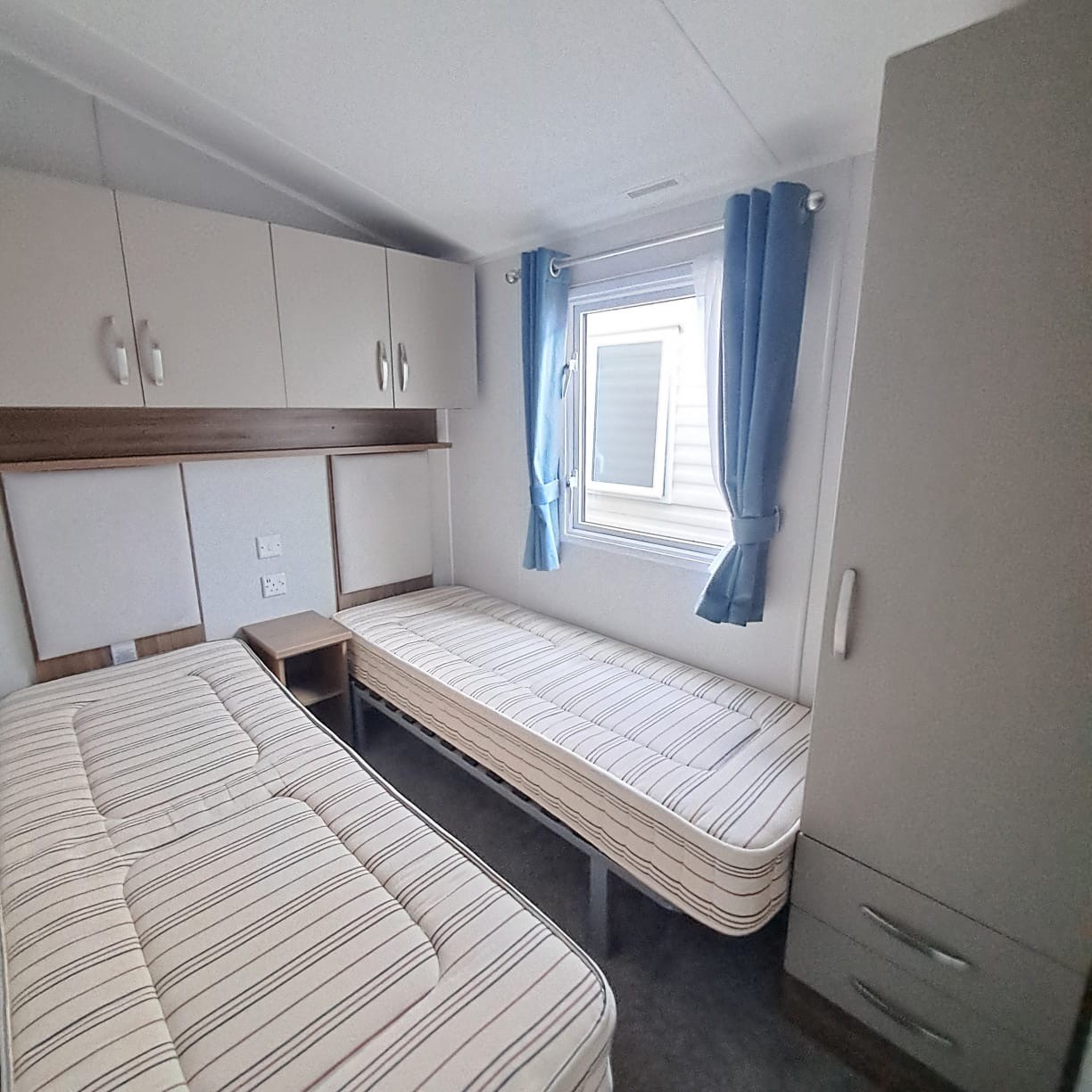 ample sized twin bedrooms with extra thick mattress' bedside cabinet, floor length wardrobes & storage