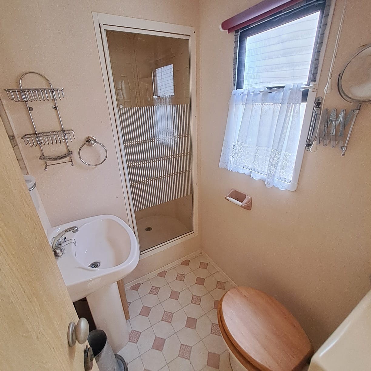 walk in shower, toilet and basin