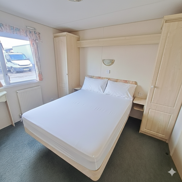 ample sized master bedroom with double bed and a fitted wardrobes either side overhead shelving