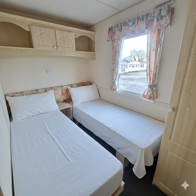twin room can be made into 3/4 double with fitted wardrobe, headboard and overhead storage