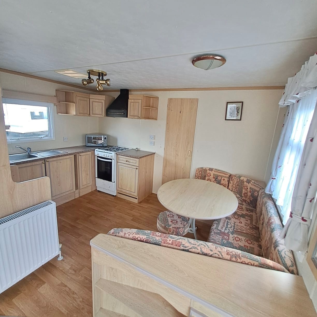 fully fitted kitchen area lino flooring, wine rack, space for the fridge freezer, microwave shelf,