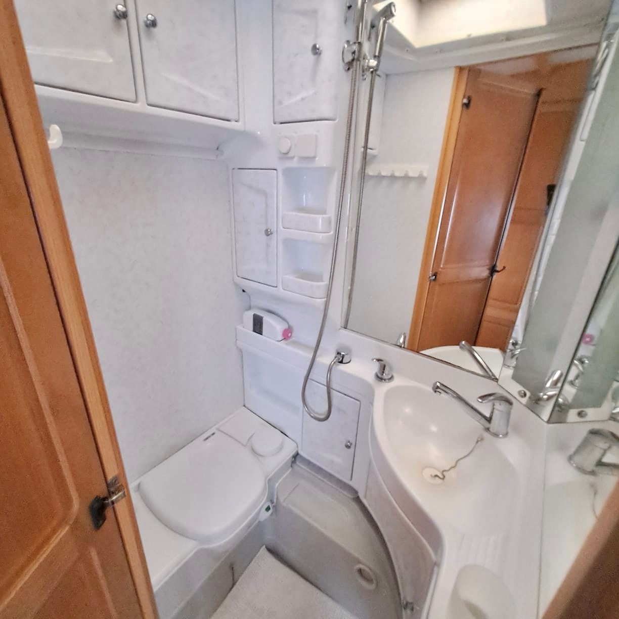 bathroom has a walk in shower, toilet, basin, mirrors, skylight veluxe, storage and toiletries shelving