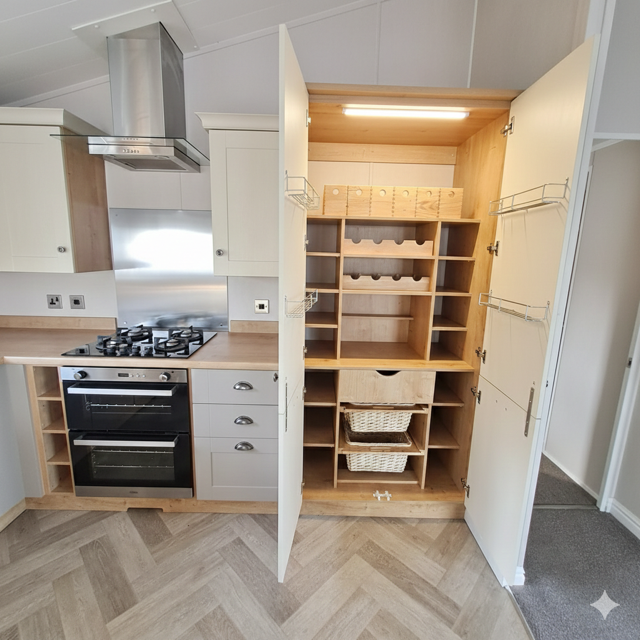 double width larder with baskets and shelves for everything foodstuffs, tins and utensils