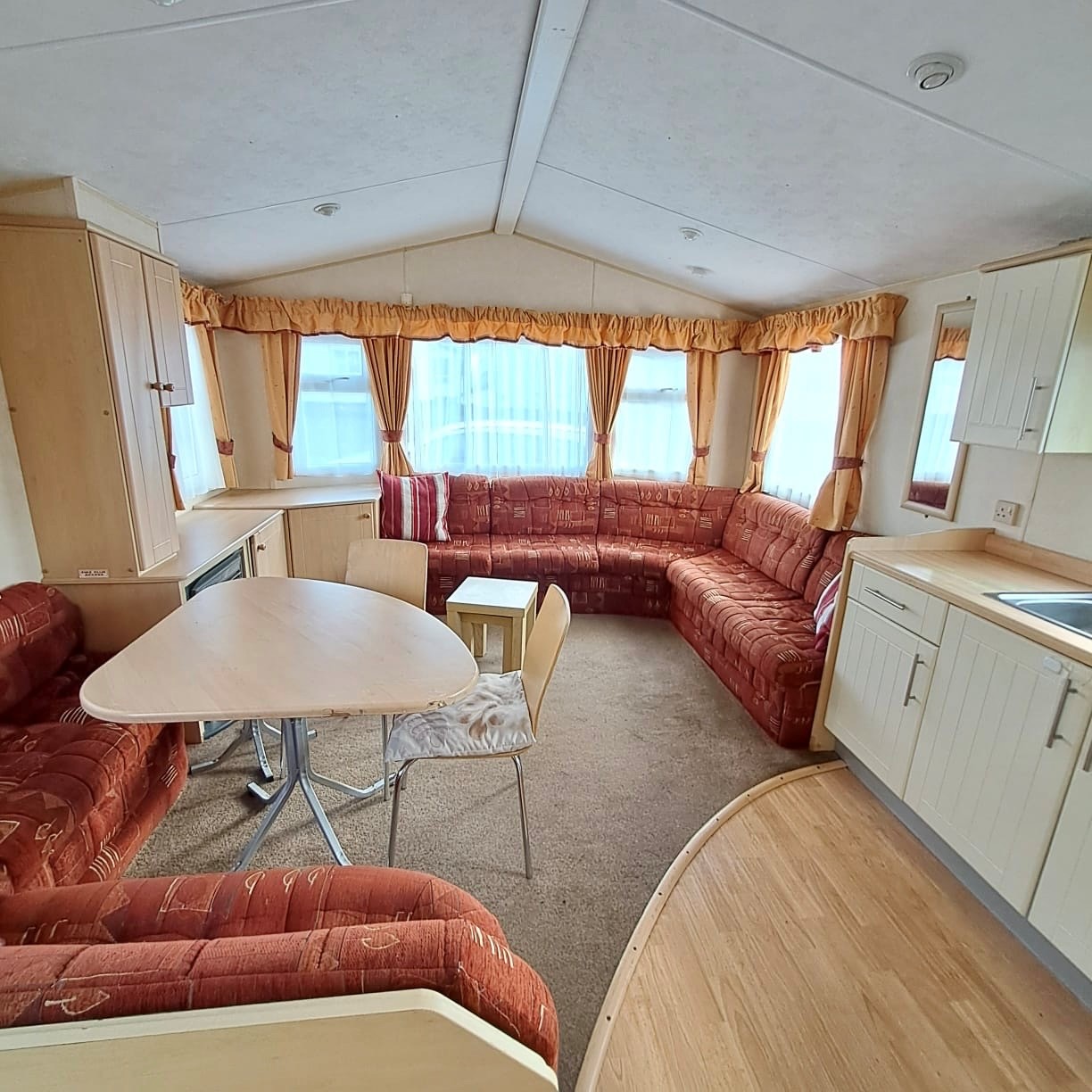 Open plan living in the lounge with seperate dining area, table and chairs and a fixed seating sofa