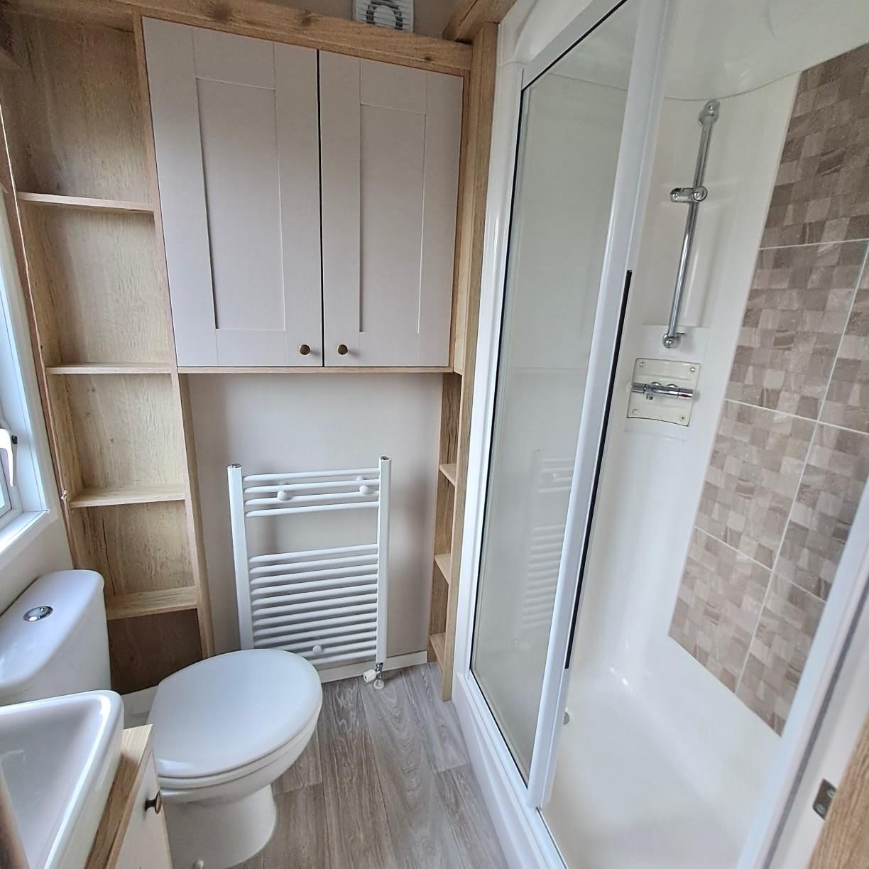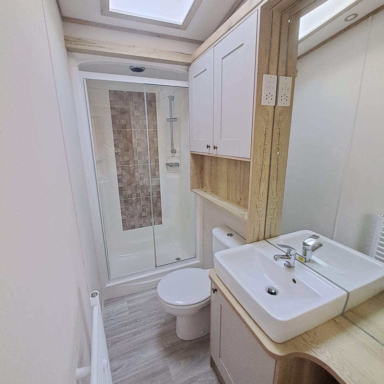 the Ambleside possesses a full Double sized shower room with toilet ceramic sink unit basin and cabinet
