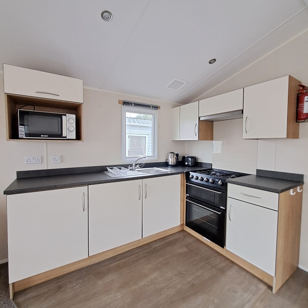 the kitchen is fully furnished and built in with a microwave shelf, worktop spaces, oven grill and hob