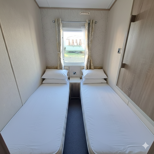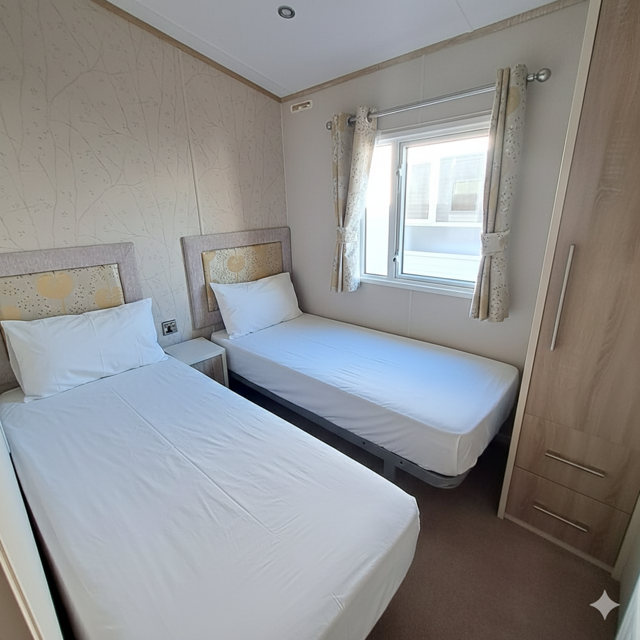twin room with padded headboards, full length wardrobes & quality mattresses throughout