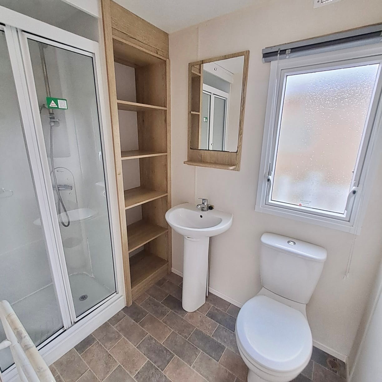 Family bathroom - lino flooring walk in shower, casing for accessories, basin, toilet, cabinet, blinds,