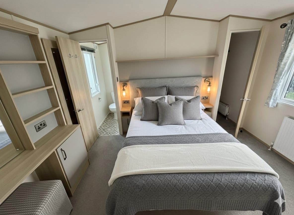 King sized bed in the Master bedroom with bedside cabinets, down lighting, headboard & storage