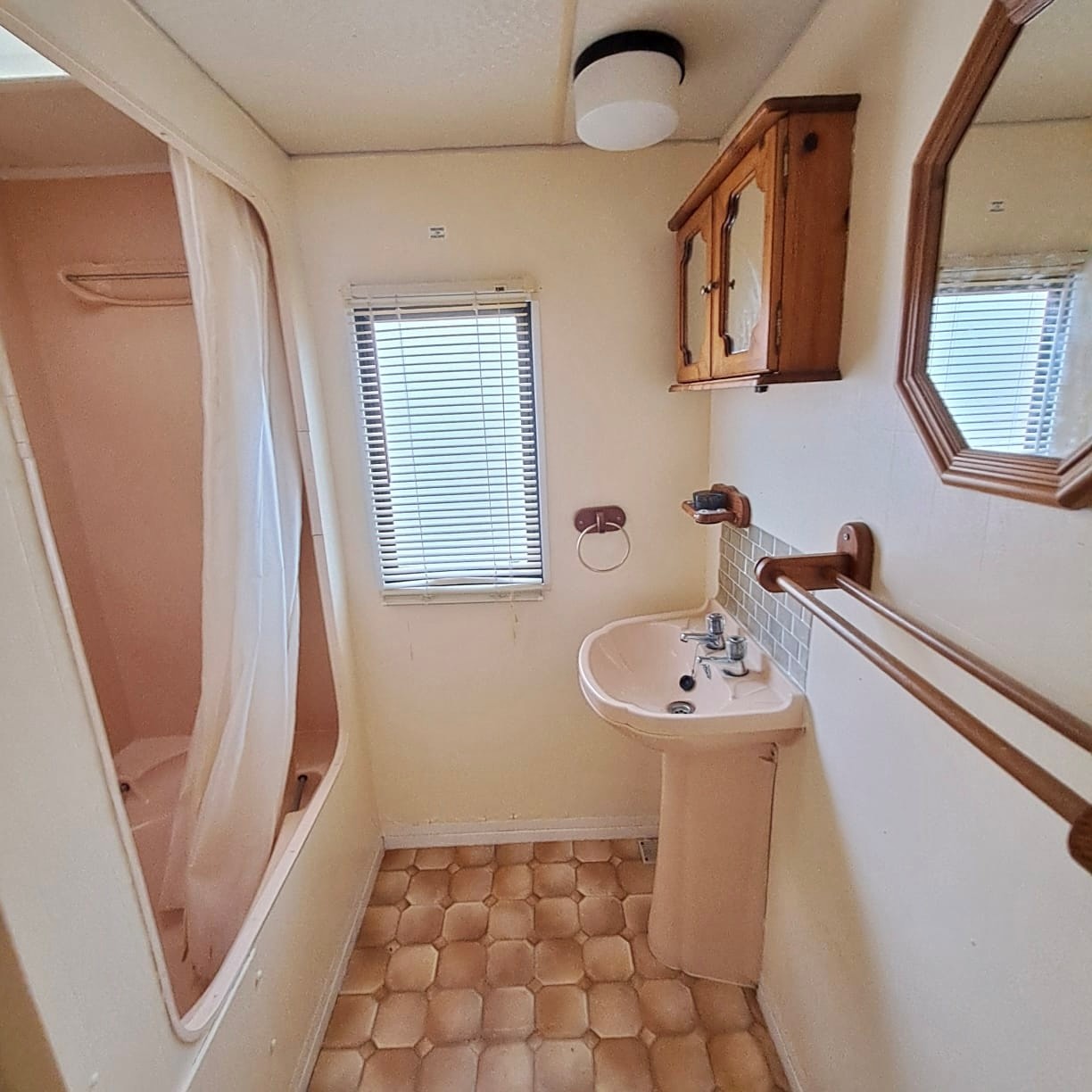 bathroom has a hip bath, shower, sink basin, bathroom cabinet, mirror, lino laminate flooring