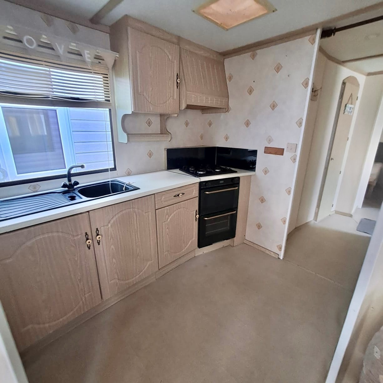 fully fitted functional kitchen with walkway leading to the hallway and bedrooms