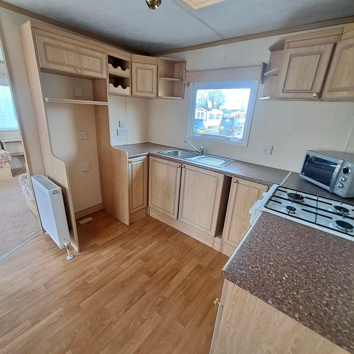 fully fitted kitchen area lino flooring, wine rack, space for the fridge freezer, microwave shelf,