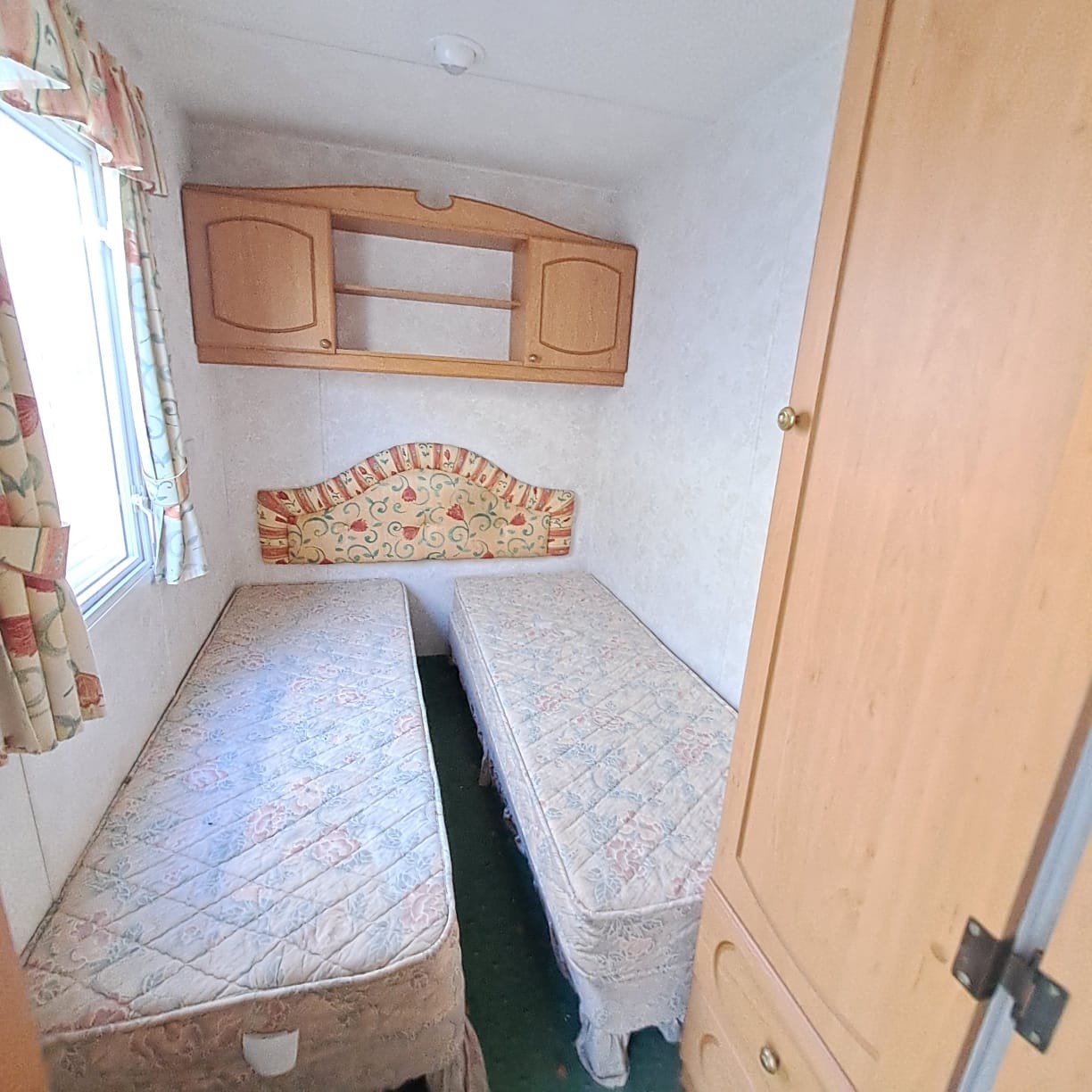 twin bedroom with fitted wardrobe, headboard, shelves and drawers