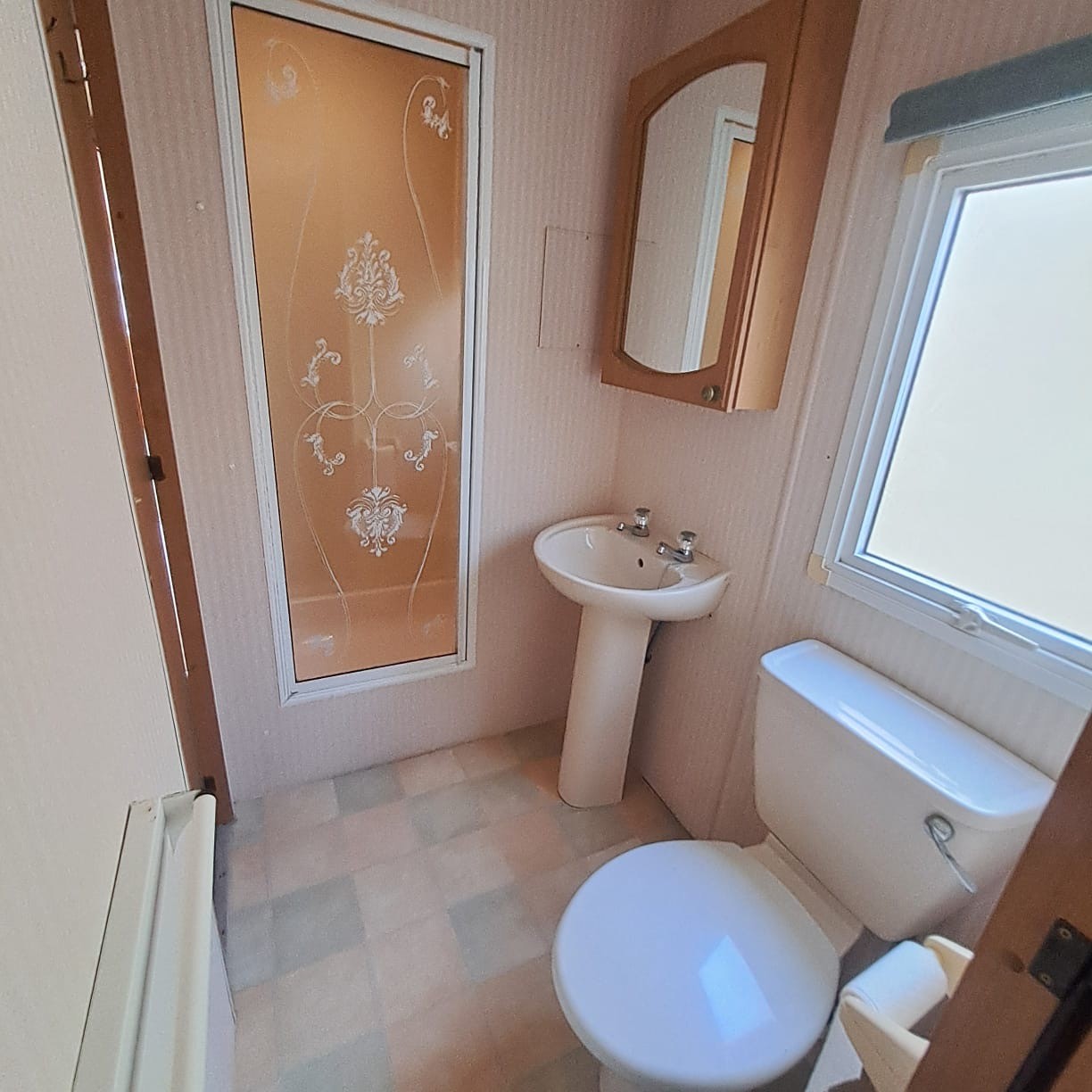 walk in bathroom with cabinet, toilet, basin and wall mounted heater ( not tested ) shower with glass door