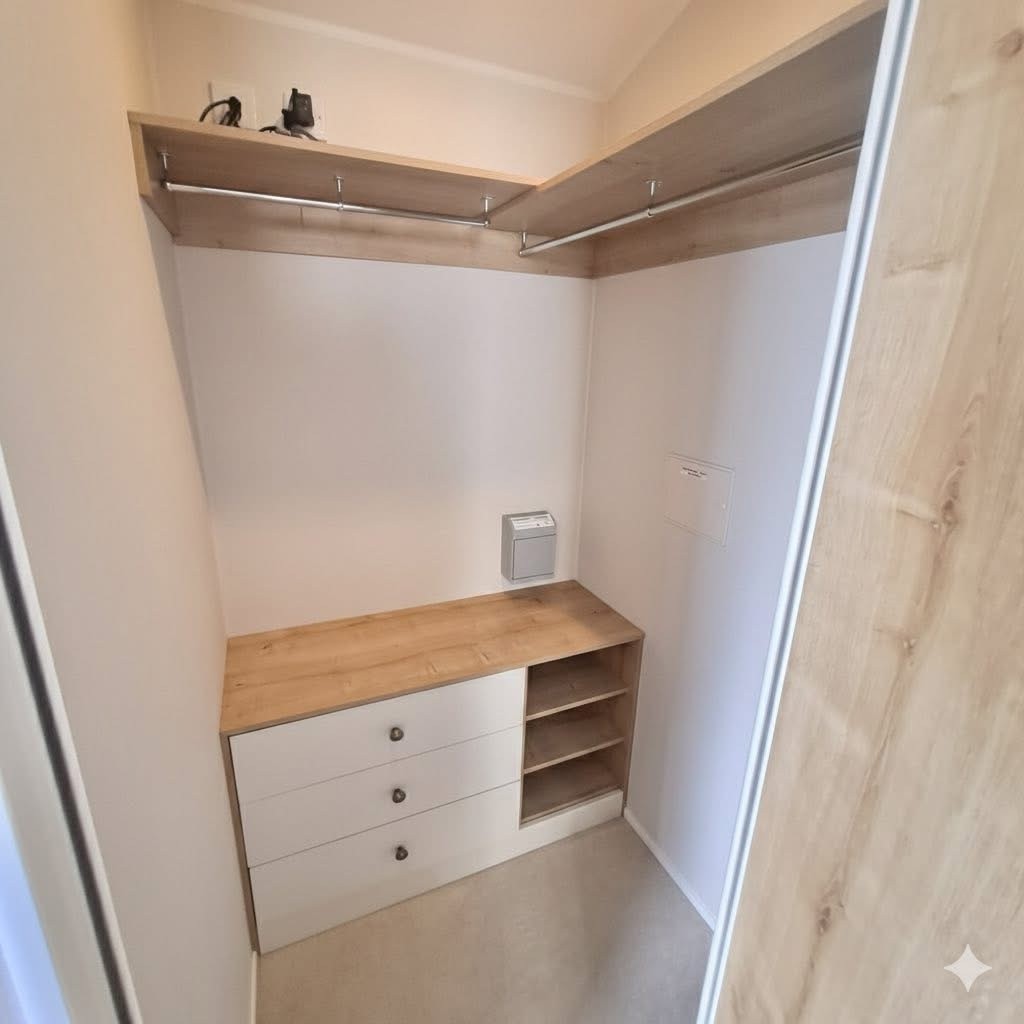 master bedroom has an angled king sized bed built into it's own headboard and cabinets