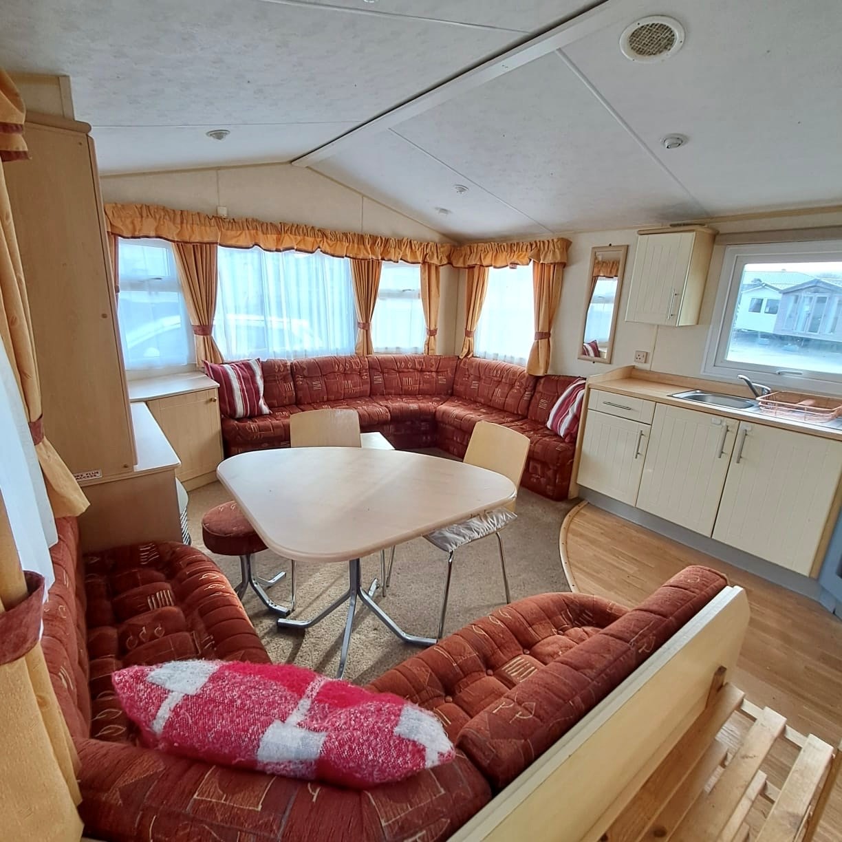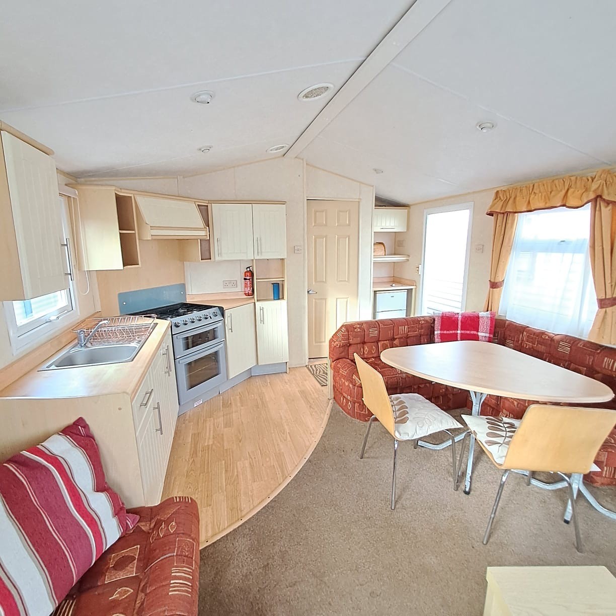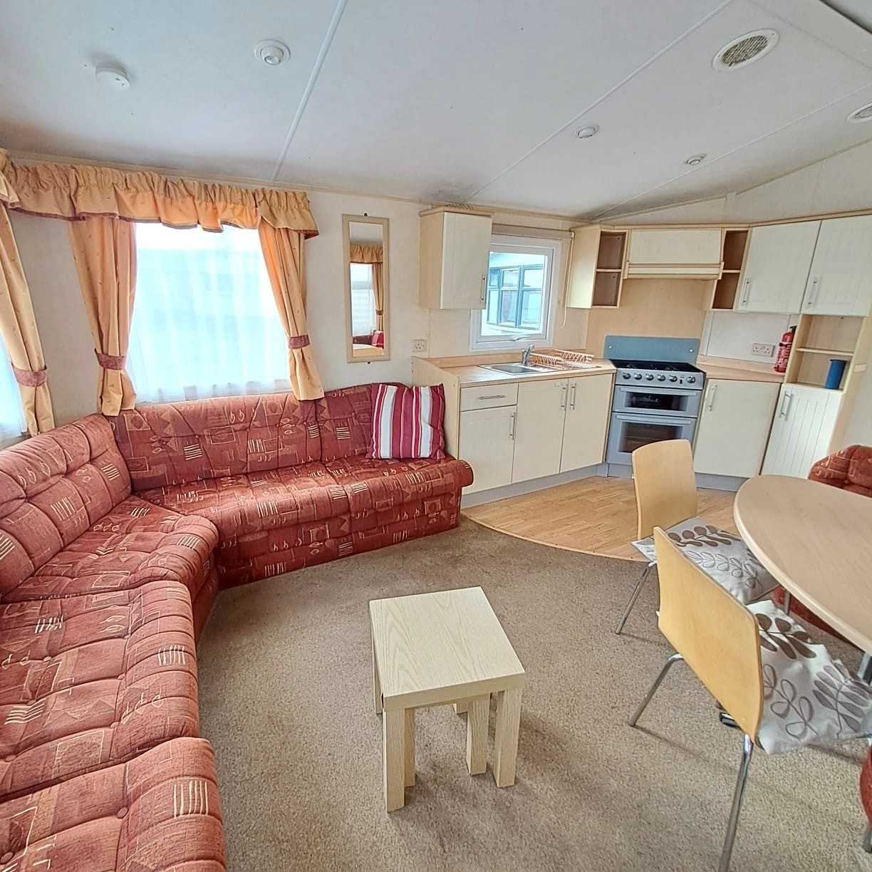 Open plan living in the lounge with seperate dining area, table and chairs and a fixed seating sofa